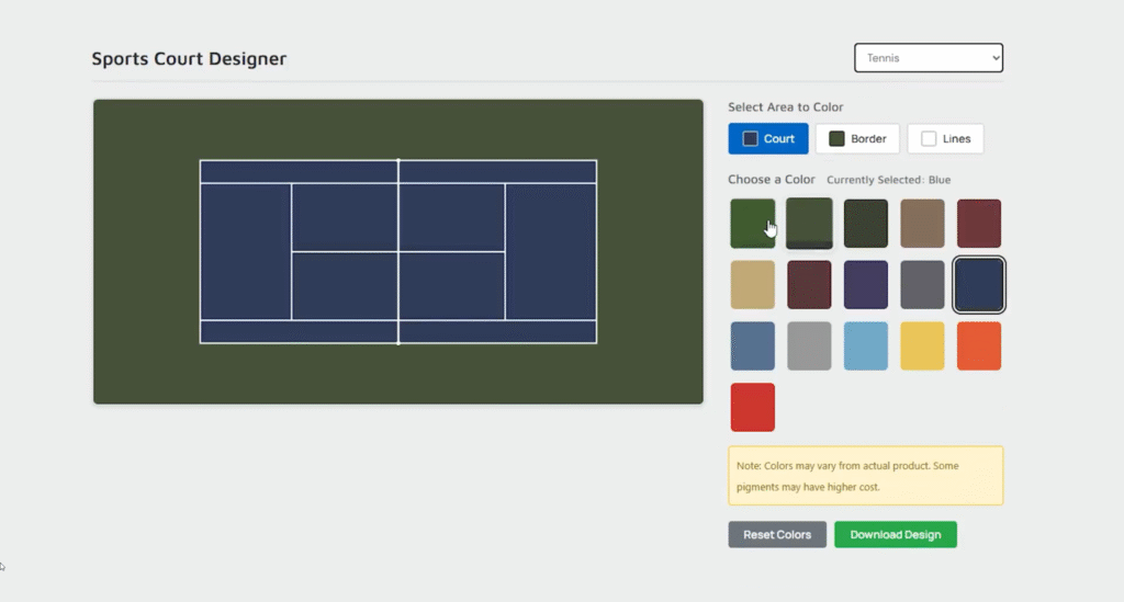 Bring your court to life before it’s built with CourtCo’s Custom Court Builder. Choose from basketball, pickleball, or tennis layouts, explore color combinations, and customize line markings to match your vision. This interactive tool makes it easy to design a court that’s uniquely yours while ensuring professional accuracy and playability.